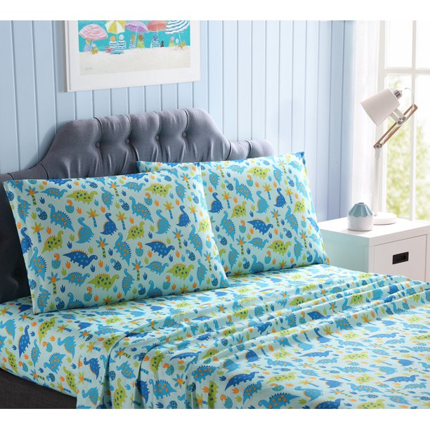 Dinosaur Sheet Set Twin | Machine washable and dryer safe. This set is made of 100% cotton. 1 flat sheet (measures 63 x 92). This multicolored dinosaur print brushed microfiber fabric sheet set fits all standard twin size mattresses and is machine washable for easy care. Perfect dinosaur bedding for boys, the jurassic world bed in a bag is a 4pc twin comforter set that includes a full comforter, fitted sheet, flat sheet and standard pillowcase.